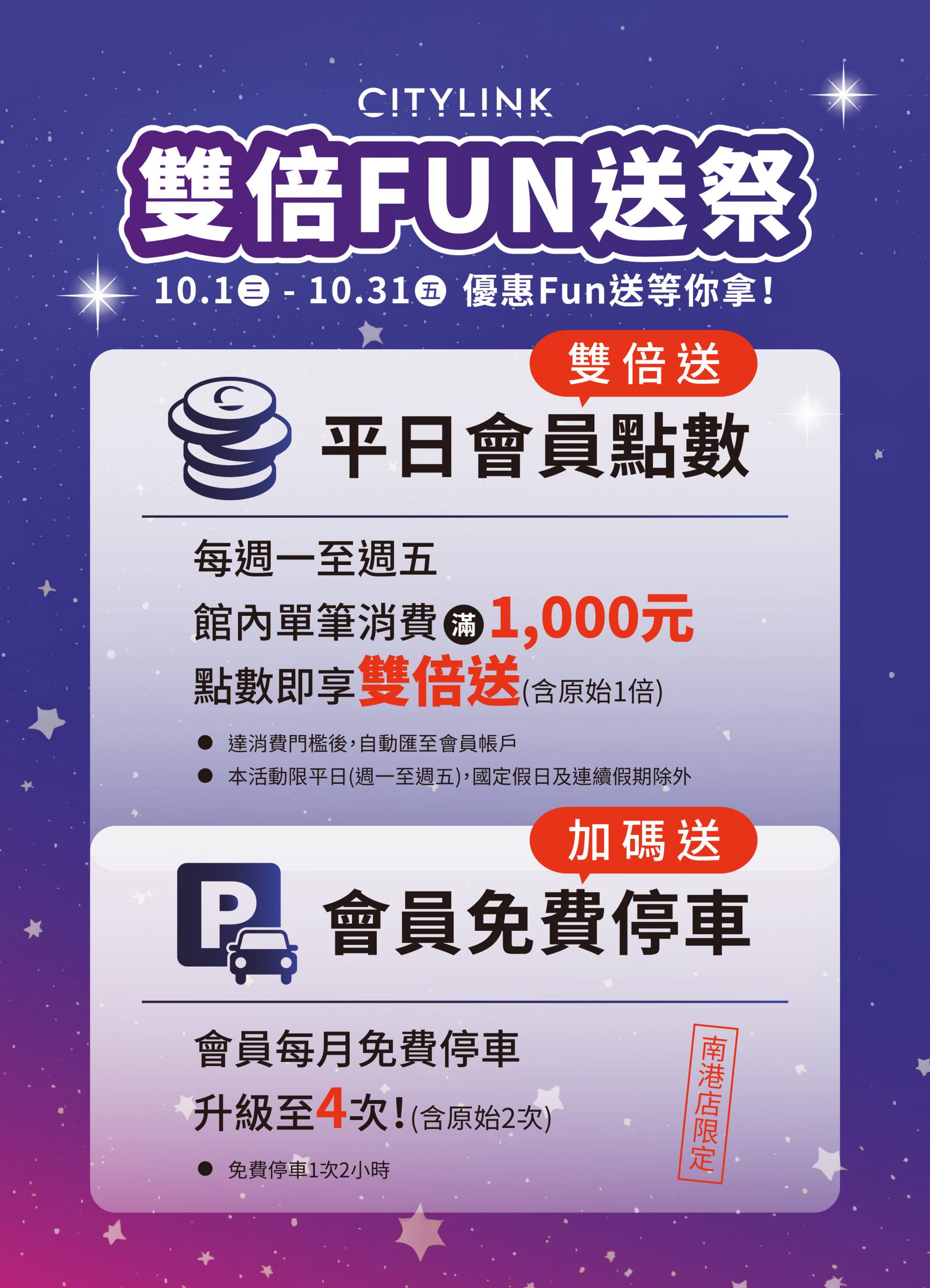 注意事項: 1.達消費門檻後,點數自動匯入會員帳戶。2.單筆交易限累積單一位會員帳戶,點數恕無法進行拆分或轉移。3.CITYLINK保有活動辦法變更、終止及最終解釋之權利,如有未盡事宜,請依官網或粉絲專頁公告為主。