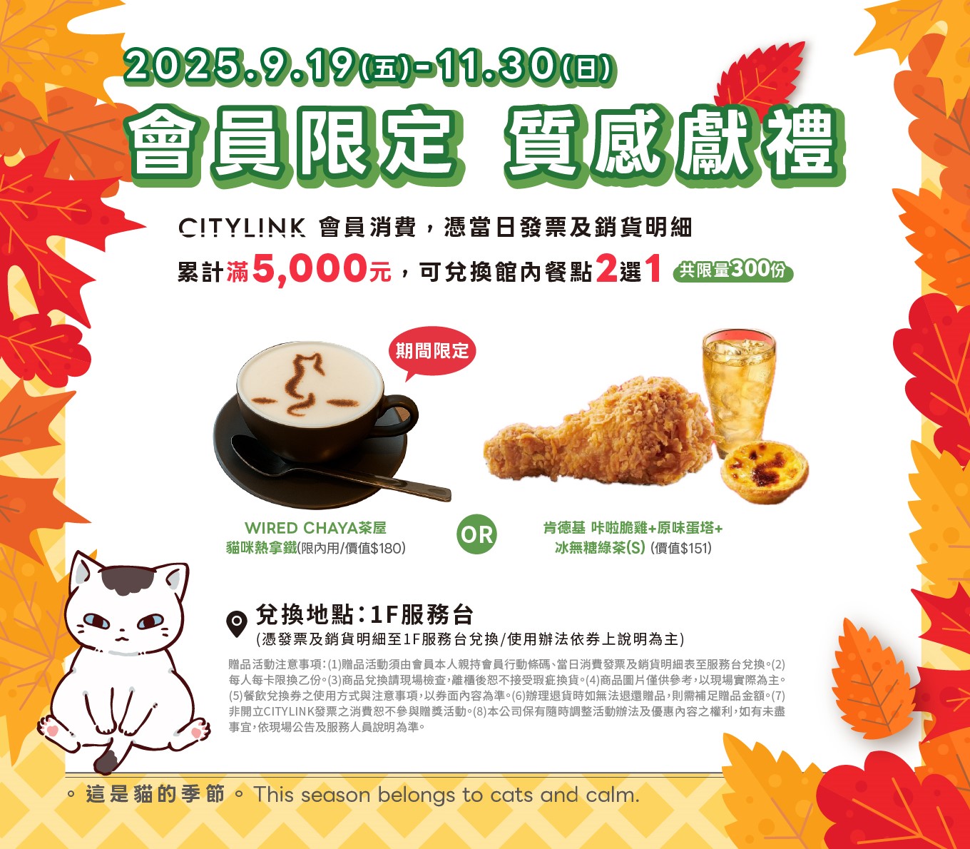 贈品活動注意事項:(1)贈品活動須由會員本人親持會員行動條碼、當日消費發票及銷貨明細表至服務台兌換。(2)每人每卡限換乙份。(3)商品兌換請現場檢查,離櫃後恕不接受瑕疵換貨。(4)商品圖片僅供參考,以現場實際為主。(5)餐飲兌換券之使用方式與注意事項,以券面內容為準。(6)辦理退貨時如無法退還贈品,則需補足贈品金額。(7)非開立CITYLINK發票之消費恕不參與贈獎活動。(8)本公司保有隨時調整活動辦法及優惠內容之權利,如有未盡事宜,依現場公告及服務人員說明為準。