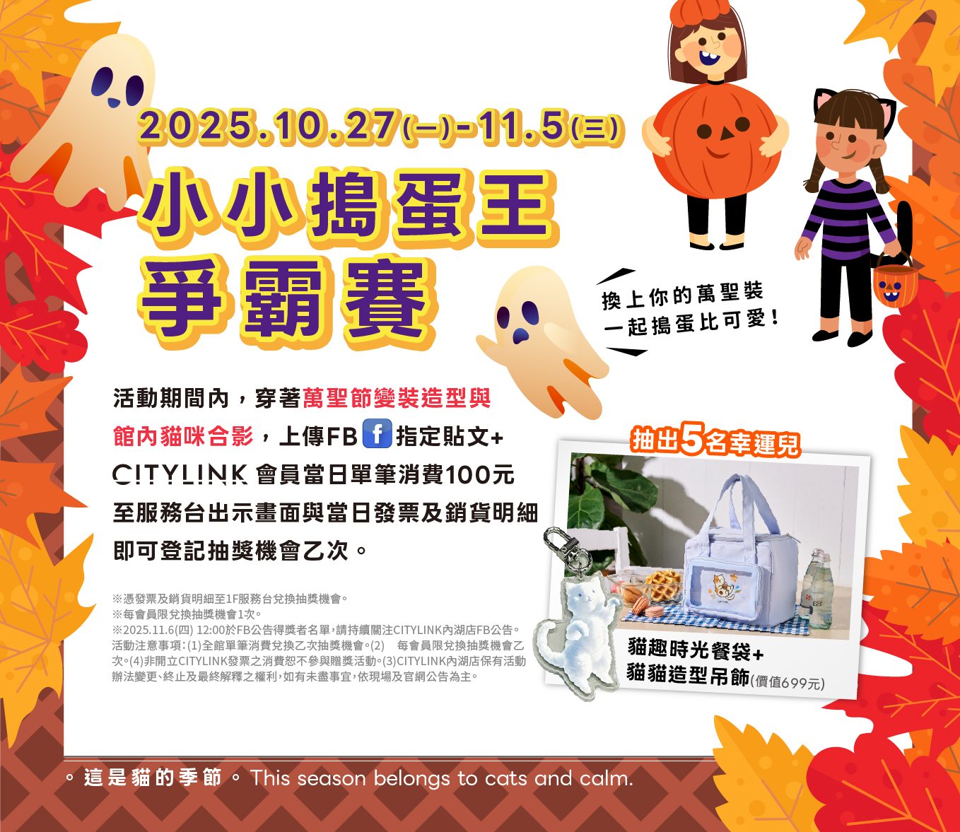 活動注意事項:(1)全館單筆消費兌換乙次抽獎機會。(2) 每會員限兌換抽獎機會乙次。(4) 非開立CITYLINK發票之消費恕不參與贈獎活動。(3)CITYLINK內湖店保有活動辦法變更、終止及最終解釋之權利,如有未盡事宜,依現場及官網公告為主。