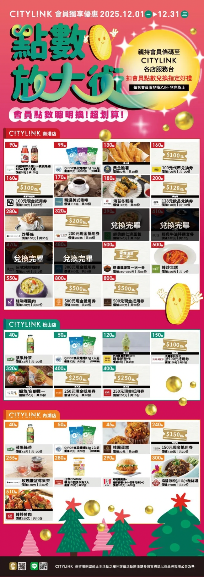 1.扣點商品需由會員本人親持會員行動條碼至指定服務台兌換(南港店品項限於南港店兌換,以此類推),每位會員每月限兌換乙次,點數經兌換後恕不退還。2. 活動票券皆為無記名有價票券,請妥為保管,如發生遺失、破損或無法辨識等情形,恕不重新補發,不便之處敬請見諒。兌換券使用期限、使用辦法及注意事項依券面說明為準,逾期恕不受理 ;多項優惠活動不得同時併用。3.商品請現場檢查,離櫃後恕不接受瑕疵換貨,辦理退貨時如無法退還贈品與點數則需補足金額。4. 部分專櫃不參與會員活動(如非開CITYLINK發票/停車費/超商/影城/臨時櫃等櫃位)詳見官網及館內公告。5.CITYLINK保有活動辦法變更、終止及最終解釋之權利,如有未盡事宜,請依官網或粉絲專頁公告為主。