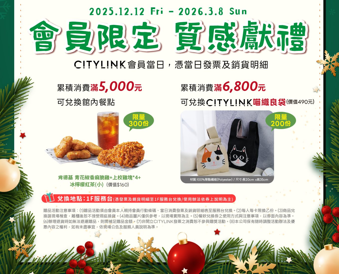 贈品活動注意事項:(1)贈品活動須由會員本人親持會員行動條碼、當日消費發票及銷貨明細表至服務台兌換。(2)每人每卡限換乙份。(3)商品兌換請現場檢查,離櫃後恕不接受瑕疵換貨。(4)商品圖片僅供參考,以現場實際為主。(5)餐飲兌換券之使用方式與注意事項,以券面內容為準。(6)辦理退貨時如無法退還贈品,則需補足贈品金額。(7)非開立CITYLINK發票之消費恕不參與贈獎活動。(8)本公司保有隨時調整活動辦法及優惠內容之權利,如有未盡事宜,依現場公告及服務人員說明為準。