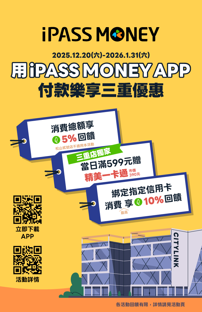 於CITYLINK三重館當日實際支付金額累積滿599元,即可憑㇐卡通iPASS MONEY APP推播通知
