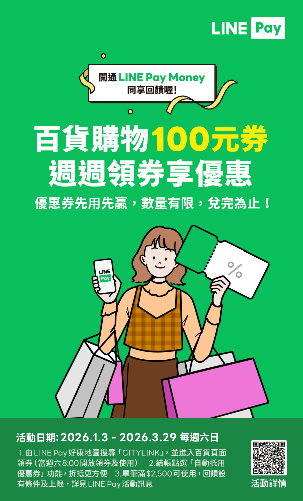 活動內容:活動期間於CITYLINK現場消費,結帳時使用 iPASS MONEY APP 開啟「付款碼」付